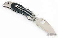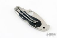 This lock back folding knife by Spyderco features a satin finish VG10 blade, and stainless steel double bolsters. Black linen micarta scales. Stainless steel clip. Excellent condition. Includes original box. One of 600
