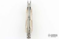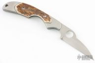 This Kiwi lockback folder by Spyderco has a satin finished wharncliffe blade with a thumbhole. The handle has stainless steel bolsters and liners and stag scales. Excellent condition. Comes with original box.