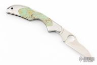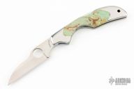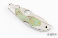 This Kiwi lockback folder has a customized turquoise handle by Santa Fe Stoneworks. Satin finished blade with thumbhole, stainless steel frame. Includes original box. Excellent condition.