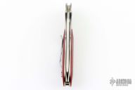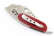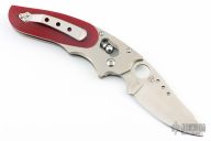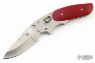 This Phoenix by Spyderco is a Howard Viele Design. The blade is satin finished with thumbhole opening. The handle has a titanium frame with red G-10 scales, stainless steel backspacer, and a tip up stainless steel clip. Has some light scratches, otherwise good condition. Comes with original box and papers.