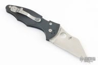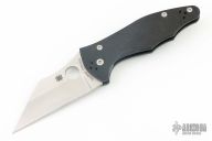 This Yojimbo 2 by Spyderco features a satin finished wharncliffe blade with thumbhole. The handle has a black G-10 frame with stainless steel liners, lock is on the spine of handle. 4-way reversible clip. Nice detent, lockup and blade seating. Comes with original box and papers. Has some light scuffs and scratches, has been resharpened, good condition otherwise.