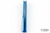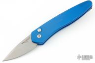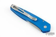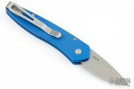 This Half Breed by Pro-Tech has a stonewashed blade with swedge. The handle has a blue aluminum frame with a stainless tip up steel pocket clip. Includes original box and papers. Excellent condition.