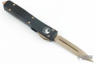 This Ultratech by Microtech features a stonewash bronzed double-edged blade with fullers. The handle has a contoured black aluminum frame with bronzed stainless steel hardware. Comes with original box and papers. Excellent condition. Dated 09/2022 and s/n 254176.