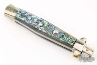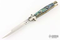 This Picklock Auto by Renzo Passcotto features a mirror finished blade with unsharpened edges. The handle has abalone scales with black linen micarta liners, brass liners and nickel silver bolsters. Has safety. Excellent condition. 50 of these were made, only 5 of them were made with abalone.