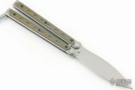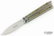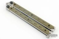 This Kimura 9 Balisong by Bradley Cutlery has a bead blasted drop point blade. The handles are bead blasted stainless steel with green G-10 overlays, T-latch at the butt. Latch can be reversed. Marked "Prototype" on the blade. Comes with a zipper case. Has a couple light scuffs, otherwise Excellent condition.