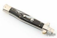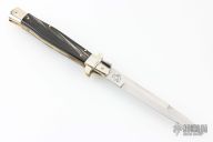 This Picklock Auto by Renzo Passcotto features a mirror finished blade with unsharpened edges. The handle has Brazilian horn scales, brass liners and nickel silver bolsters. Has safety. Excellent condition. 50 of these were made.