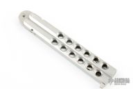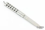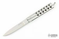 This balisong by JL Klein features a full ground drop point bade. The handles are comprised of satin finish titanium with full channel construction and latch. Comes with Zipper case. Has scuffs and scratches, fair condition.