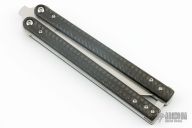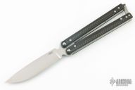 This balisong by Hiebel Knives features a hand rub satin finished drop point blade. The handles have titanium liners, spacers, and carbon fiber covers. Has T-latch. Comes with zipper case. Has a couple light scuffs, excellent condition otherwise.