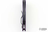 Equally unique, this knife's handle showcases brilliant purple G-10 scales with a peel-ply texture for a secure, non-slip grip. To complement the blade's black DLC finish, the handle's stainless steel liners, four-position pocket clip, and all other hardware also feature durable black coatings.