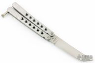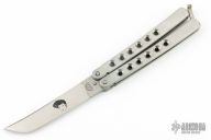 This Balisong by Smoky Mountain Knife Works features a satin finished upswept blade. The handles are stainless steel with a t-latch. Has some scratches, otherwise good condition.