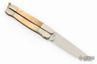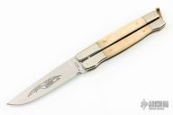 This Balisong by Parker Cutlery Company features a satin finished blade. The handles are comprised of nickel silver double bolsters with bone scales over brass liners. Brass T latch on pommel. Comes with a zipper case. Has a couple scratches, otherwise great condition.