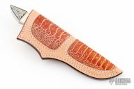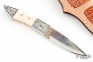 This Hunter by RB McNabb features a two-tone blade with mirror polished grinds and satin finished flats, the flats have been engraved by the maker, false top edge, .158075" blade stock and 1.380" blade depth, full tapered tang construction. The handle has dovetailed and engraved 416 stainless steel bolsters with 24k gold inlays, giraffe leg bone scales with red liners. Comes with a brown leather sheath with ostrich leg skin inlays. New from maker. Engraving done by the maker.