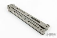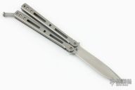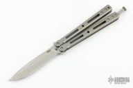 This Blade HQ exclusive DB3.1 Balisong has a stonewashed 440C stainless steel blade and gray finished titanium handles.