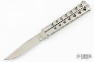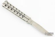 This Seto Balisong has a satin finished clip point blade with a false top edge. The handle has titanium handles. Comes with a zipper case. Has light scuffs/scratches otherwise excellent condition.