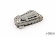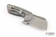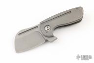 This Custom Kutzu 2.0 by Quest Knives features a bead blasted sheepsfoot style blade with fullers and flipper. The handle is comprised of bead blasted and machined titanium over a black G10 backspacer. Titanium hardware and tip up clip. Has scuffs and scratches, otherwise good user condition.