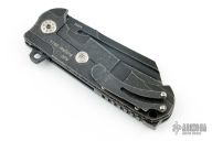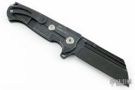 This ADV Butcher framelock flipper has a black tumble finished blade with false top edge, fuller and notched thumbrest and flipper. Has a black tumble finished titanium frame, tumbled titanium backspacer, titanium tip up clip. Nice detent, lockup and blade seating. Has been resharpened, otherwise excellent condition.