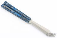 This BRS Replicant features a two-tone finished clip point tanto blade with hand rub satin finish flats and bead blast finish bevels. The handle has a black/blue G-10 over titanium liners and backspacers. Stainless steel T latch. Excellent condition.