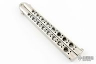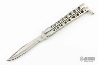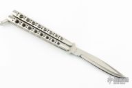 This early Deep Belly Bowie Balisong features a Jody Samson ground satin finished blade. The handles are satin finished stainless steel. Comes with a zipper case. Has some light scuffs and scratches, excellent condition otherwise.
