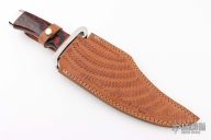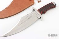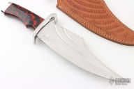 This knife by Ozair knives features a mirror finished blade with false top edge, fullers and fileworked spine, .184" blade stock and 3.005" blade depth, hidden tang construction. The handle has a stainless steel guard and butt, red/black acrylic grip with red/brass spacers. Comes with a hand tooled brown leather sheath. Has a couple of small oxidation spots, otherwise excellent condition.