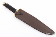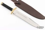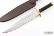 This Bowie by Jim Austin features a satin finished blade with sawteeth on the spine, .212" blade stock and 1.748" blade depth, hidden tang construction. The handle has a brass guard and butt with black twisted wire wrapped grip. Comes with a brown leather sheath. Excellent condition.