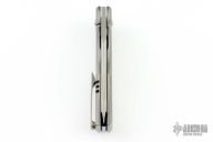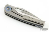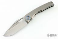 This BBM V2 by Nick Chuprin and Robert Carter features a hand ground satin finished blade with fullers and thumbhole. The handle has a zircblast titanium frame, anodized pivot collar, backspacer and tip up clip. Rides on bearings, nice detent, lockup and blade seating. Comes with a zippered case and COA.  Excellent Condition.