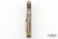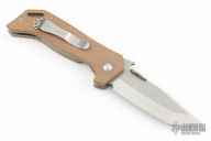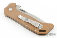 This ETAK-B by Emerson Knives features a tumble finished tanto blade with notched thumbrest, upgraded thumbdisc and wave features. The handle has tan G-10 scales with titanium liners, standoffs and tip up black stainless steel clip, lanyard hole at the butt. Comes with original box and papers. S/N 0039 and dated 2013. Has a couple light scuffs and scratches, great condition otherwise.