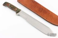 This Fighter by CFK Cutlery features a satin finished blade with false top edge and fileworked spine, .172" blade stock and 1.914" blade depth, full tang construction. The handle has canvas micarta scales. Comes with a brown leather sheath. Excellent condition.