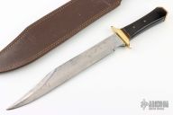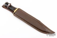 This bowie features a satin finished blade with false top edge, .195" blade stock and 1.422" blade depth, hidden tang construction. The handle has a brass guard and butt, ebony wood grip. Comes with a brown leather sheath. Has some scratches and oxidation, good user condition.