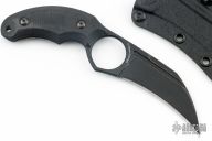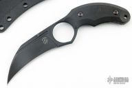 This Harpy by Bastinelli Knives features a black idroglider coated N690 blade with fullers and a false top edge, .145" blade stock and 1.14" blade depth, full tang construction. The handle has black  G-10 scales. Comes with a kydex sheath with belt clip and original box. Has scuffs and scratches, good condition otherwise.