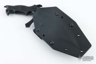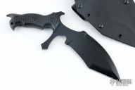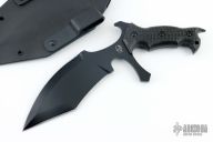 This Vampire UUK is a Laci Szabo design made by Robert Martin. It features a black coated double-edged blade, .264" blade thickness and 2.441" blade depth, full tang construction. The handle has black micarta scales with frag pattern. The UUK, or Urban Utility Knife is the most well-known of Laci Szabo's designs. One mean field-tested tactical. Comes with kydex sheath with belt loops and zipper case. Has some light scuffs and scratches, great condition otherwise.