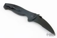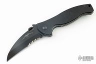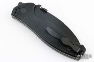 This Police SARK from Emerson features a black chisel ground partially serrated blade with notched thumbrest, upgraded thumbdisc and wave feature. The handle has black G-10 scales, titanium liners, black G-10 backspacer, and a tip up black stainless steel clip. Nice detent, lockup and blade seating. Serial Number 300 dated 2001. Has some light scuffs and scratches, otherwise excellent condition.