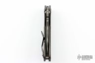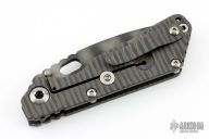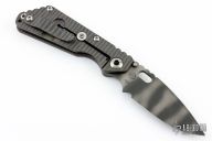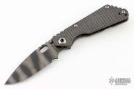 This Mick Strider Performance Series SMF framelock folder features a tiger striped drop point blade with thumbhole and notched thumbrest. The handle has a flamed titanium frame with titanium clip, tip up carry. Jimping on blade spine. Includes Hinderer "Lock Bar Stabilizer" for maximum reverse lock retention. Nice detent, lockup and blade seating. Excellent Condition.