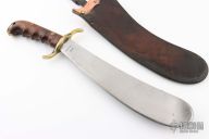 The M-1904 features a 12" heavy curved back blade, with a curved cutting edge with a big belly near the "non-threatening" rounded tip. It is marked near the cross guard with S A / (Flaming bomb) / 1914 on one side, and U.S. / 36882 on the reverse. The heavy ended blade made these very effective for clearing brush and jungle debris, as well as making them excellent hand weapons in close combat. The edge is single beveled, which helps with strength and ease of sharpening.