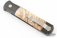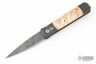 This Custom Godfather by Protech Knives features a Damascus blade. The handle has a black stainless frame with mammoth molar inlays and a mosaic pin inlaid button. Tip up satin finished titanium clip. Comes with original box and papers. Has some light scuffs, excellent condition otherwise. Dated 2008, #49.