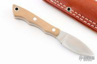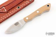 This Micro Canadian by Bark River features a satin finished blade, .111" blade stock and .736" blade depth, full tang construction. The handle has antique bone linen micarta scales with aluminum pins and lanyard tube. Comes with a brown leather sheath, original box and papers. Excellent condition.