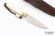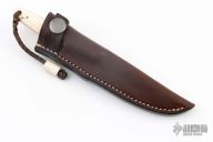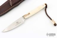 This "Bateleur" by Arno Bernard features a tumbled finished drop point blade with a notched thumbrest, .098" blade stock and .789" blade depth, full tang construction. The handle features carved warthog tusk scales. Includes a brown leather sheath. Comes with original box and papers. Excellent Condition.