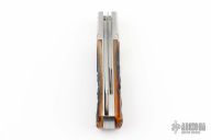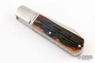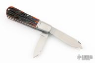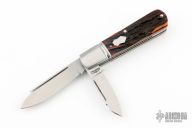 This Two-Blade Barlow by Casey Berryhill features hand rub satin finished blades with nail nicks. The handle has fluted stainless steel bolsters with integral liners with fileworked spines, stag covers, stainless steel escutcheon and springs. Has half-stop, flush in all positions. Comes with zippered case. New from maker. Comes with COA dated 11/2023.