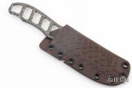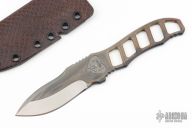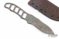 This Saoirse fixed blade by Frank Landau features a chisel ground blade with temper color finish, notched thumb and finger rests, skeletonized tang and handle. This knife has been laser engraved with a skull motif. Comes with a tooled leather sheath. New from maker. Magnacut at 65hrc