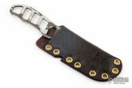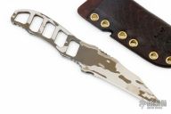 This Saoirse fixed blade by Frank Landau features a chisel ground blade with notched thumb and finger rests, skeletonized tang and handle. This knife has been laser engraved with a camo motif. Comes with a tooled leather sheath. New from maker. Magnacut at 65hrc