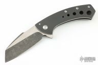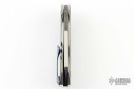 This Launch by the Fischer Bros features a dark tumble finished blade with satin flats, has flipper. The handle has a KG ceramic coated titanium frame, carbon fiber backspacer and tip up Timascus clip. Nice detent and lockup, but the blade is off center. Tried to tighten the pivot, but can't get it tighter. Rides on bearings. Has some light scuffs on the frame, otherwise excellent condition.