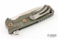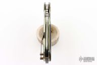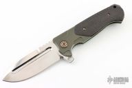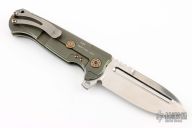 This Pathfinder framelock flipper by Andre De Villiers has a satin finished blade with fullers, notched flipper and thumbrest. Handle has a bead blasted and anodized titanium frame, lightning strike carbon fiber scale, tumble finished titanium backspacer and tip up clip. Has stainless steel lockbar insert and lockbar stabilizer, anodized titanium screws and pivot. Nice detent, lockup and blade seating. Comes with a nylon zippered case. Has some scuffs, otherwise good condition. Dated 2015.