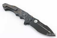 The Alpha folding knife from Andre de Villiers is a masterwork combining functionality and personality. This one has a black finished blade with thumbhole, notched thumbrest and flipper. It swings smoothly on a ball-bearing system and has both a thumb hole and flipper opener; it can also be opened or closed with a flick of the wrist when the carbon fiber-inlaid button lock is held down. A safety switch on the side allows the blade to be locked in the closed position or provides an additional level of safety in the open position. It has a milled titanium handle in a black finish with brass dust marble carbon fiber inlays that offers an extremely comfortable grip. A jimped, black titanium backstrap with a lanyard hole and a tip-up, black, titanium pocket clip with hidden screws. Comes with a zippered case. "233-2021" on the ricasso. Excellent condition.
