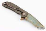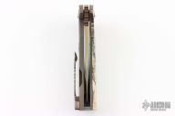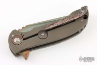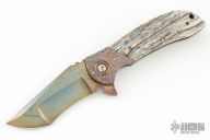 This Framelock Flipper by Melvin Lozada features a colored Damascus tanto blade with flipper. The handle has a Mosaic Damascus dovetailed bolsters, mammoth tooth scale with a black liner, anodized and blasted titanium frame, Damascus backspacer and a Mosaic Damascus tip up clip, anodized titanium pivot collars and a Damascus overtravel stop. Rides on bearings, nice detent, lockup and blade seating. Excellent condition.