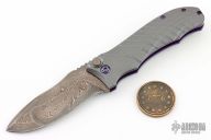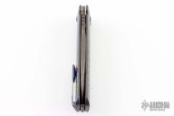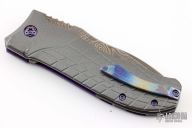 This Button Lock Folder by Frank Landau features a Baker Forge Damascus blade with false top edge and notched thumbrest. The handle has a milled and coated titanium frame with an anodized titanium tip up clip. Nice lockup and blade seating. The button must be pressed to open and close the knife. New from maker. Comes with cloth case and a brass challenge coin.
