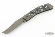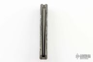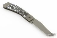 This Mini Cyborg Jack slipjoint model by Jack Wolf Knives features a blast and tumble finished clip point blade with nailnick. The handle has integral bead blast finish pinched and fluted titanium front and rear bolsters and liners, carbon fiber scales with a stainless spring. Comes with box, metallic tube with Sean Tiffany artwork, leather slip, sticker and microfiber cleaning cloth. New from Maker.