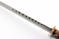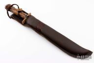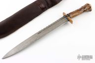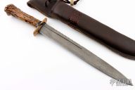 This Fighter by Bryan Crow features a Damascus blade with fullers and fileworked spine, .213" blade stock and 1.427" blade depth, hidden tang construction. The handle has a mammoth ivory guard and crown stag grip. Comes with a brown leather sheath. The handle has been coated/stabilized with epoxy. Excellent condition. The makers mark is on the handle and dated '07