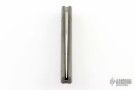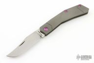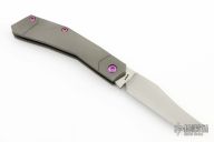 This Mini Cyborg Jack slipjoint model by Jack Wolf Knives features a hand satin finished clip point blade with nailnick. The handle has a bead blast finish, milled pinched and fluted titanium front and rear bolsters with anodized hardware, and a stainless spring. Comes with box, metallic tube with Sean Tiffany artwork, leather slip, sticker and microfiber cleaning cloth. New from Maker.