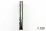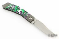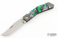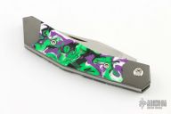 This Mini Cyborg Jack slipjoint model by Jack Wolf Knives features a hand satin finished clip point blade with nailnick. The handle has integral bead blast finish pinched and fluted titanium front and rear bolsters and liners, resin scales with a stainless spring. Comes with box, metallic tube with Sean Tiffany artwork, leather slip, sticker and microfiber cleaning cloth. New from Maker.