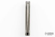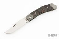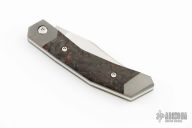 This Mini Cyborg Jack slipjoint model by Jack Wolf Knives features a belt satin finished clip point blade with nailnick. The handle has integral bead blast finish pinched and fluted titanium front and rear bolsters and liners, Fat Carbon scales with a stainless spring. Comes with box, metallic tube with Sean Tiffany artwork, leather slip, sticker and microfiber cleaning cloth. New from Maker.