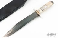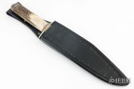 This bowie by Harry Leo Smith features a blued blade with false top edge, .191" blade stock and 1.638" blade depth, hidden tang construction. The handle has a stainless steel guard, brass plate infront of the guard, fileworked copper spacer, stag grip with stainless steel arrowhead escutcheon, Native American head on the butt. Comes with a hand tooled black leather sheath. Has some light scratches, otherwise excellent condition.